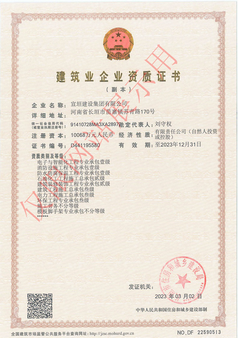 3月2日,根據(jù)長垣市住房和城鄉(xiāng)建設(shè)局關(guān)于核準(zhǔn)長垣市2023年第一批建筑業(yè)企業(yè)資質(zhì)名單的公告,宣垣建設(shè)集團(tuán)有限公司獲得石油化工工程施工總承包貳級資質(zhì),為公司高質(zhì)量發(fā)展增添了新動能。